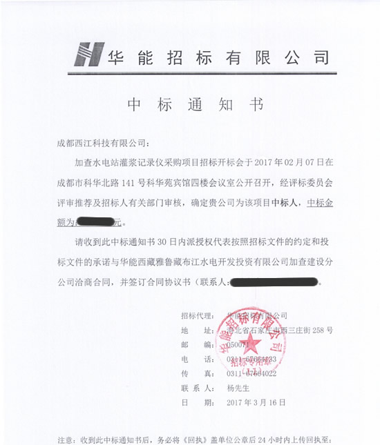2017年3月16日,我公司收到华能招标有限公司正式签发的加查水电站灌浆记录仪采购项目中标通知书,我公司以优异的产品性能和可靠的技术方案,成为该水电站的唯一指定记录仪供应商,为西南地区销售业绩再添重要一笔。这次中标是对我公司产品的重大鼓励,也是对我公司品牌实力的再次肯定。在与中国华能集团公司的合作中,我们将竭诚为用户提供高品质的产品和优质的服务。